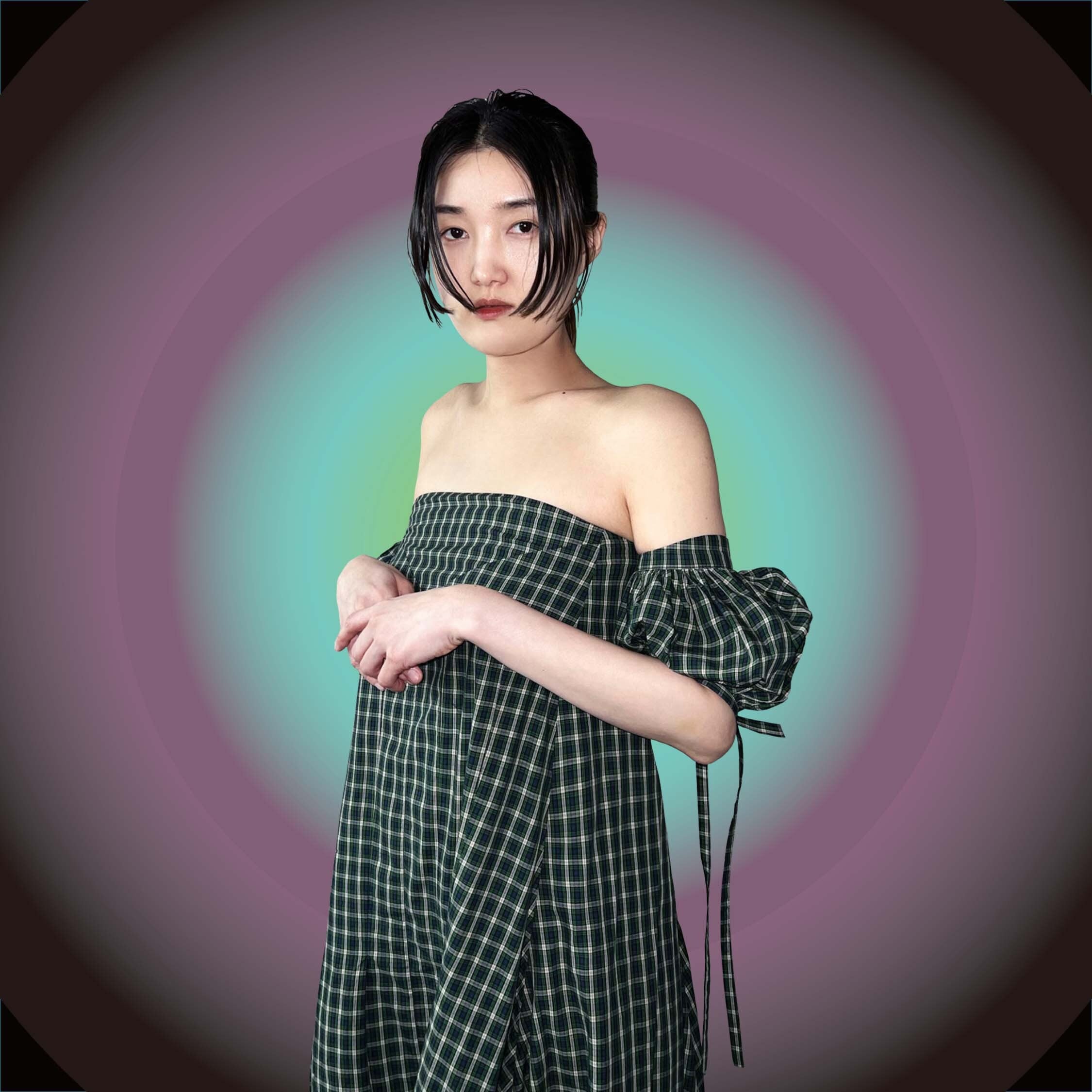 パフスリーブのオフショルダーワンピース。