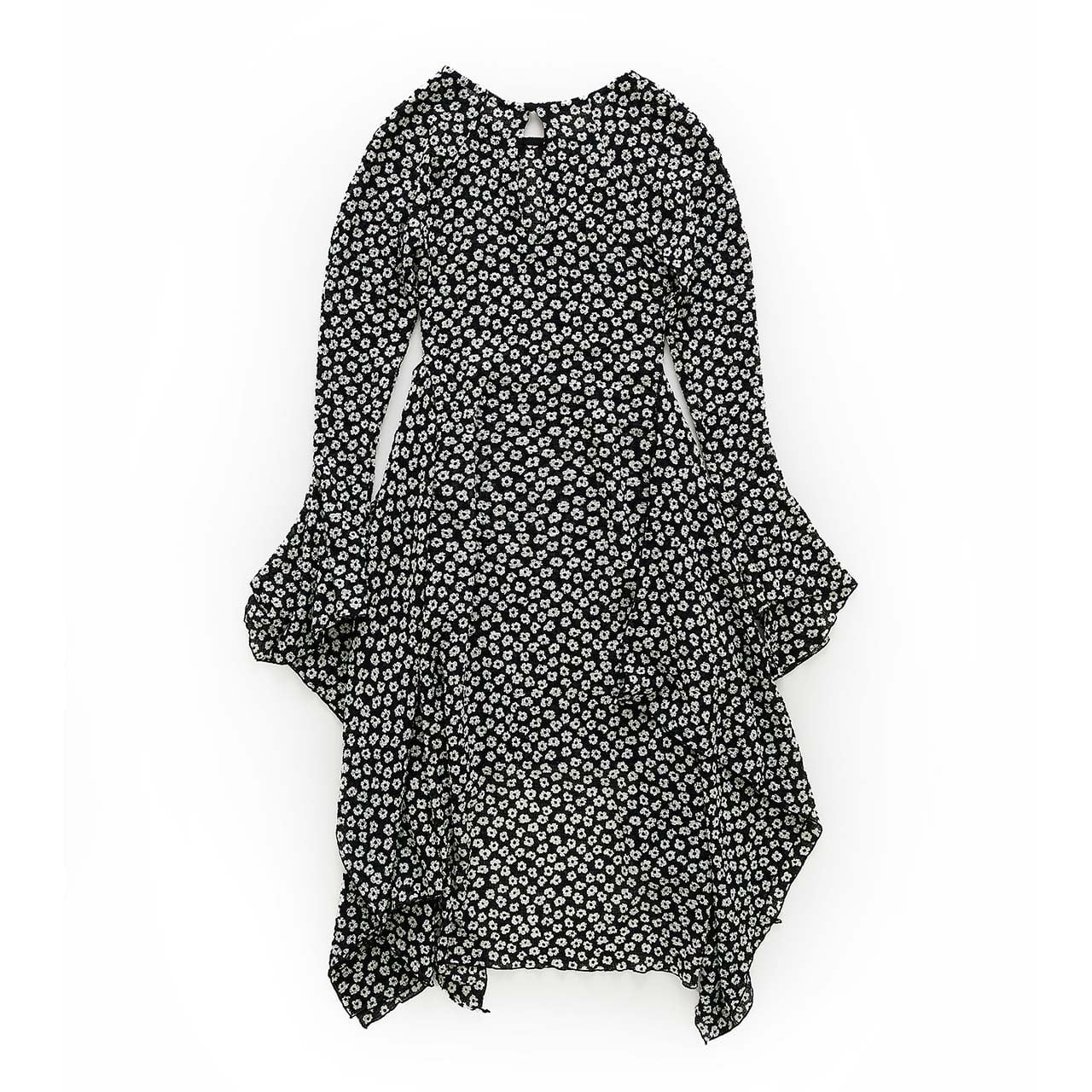 袖口のフレアと前後スカートの長さがアンバランスなのが特徴のアイテム。